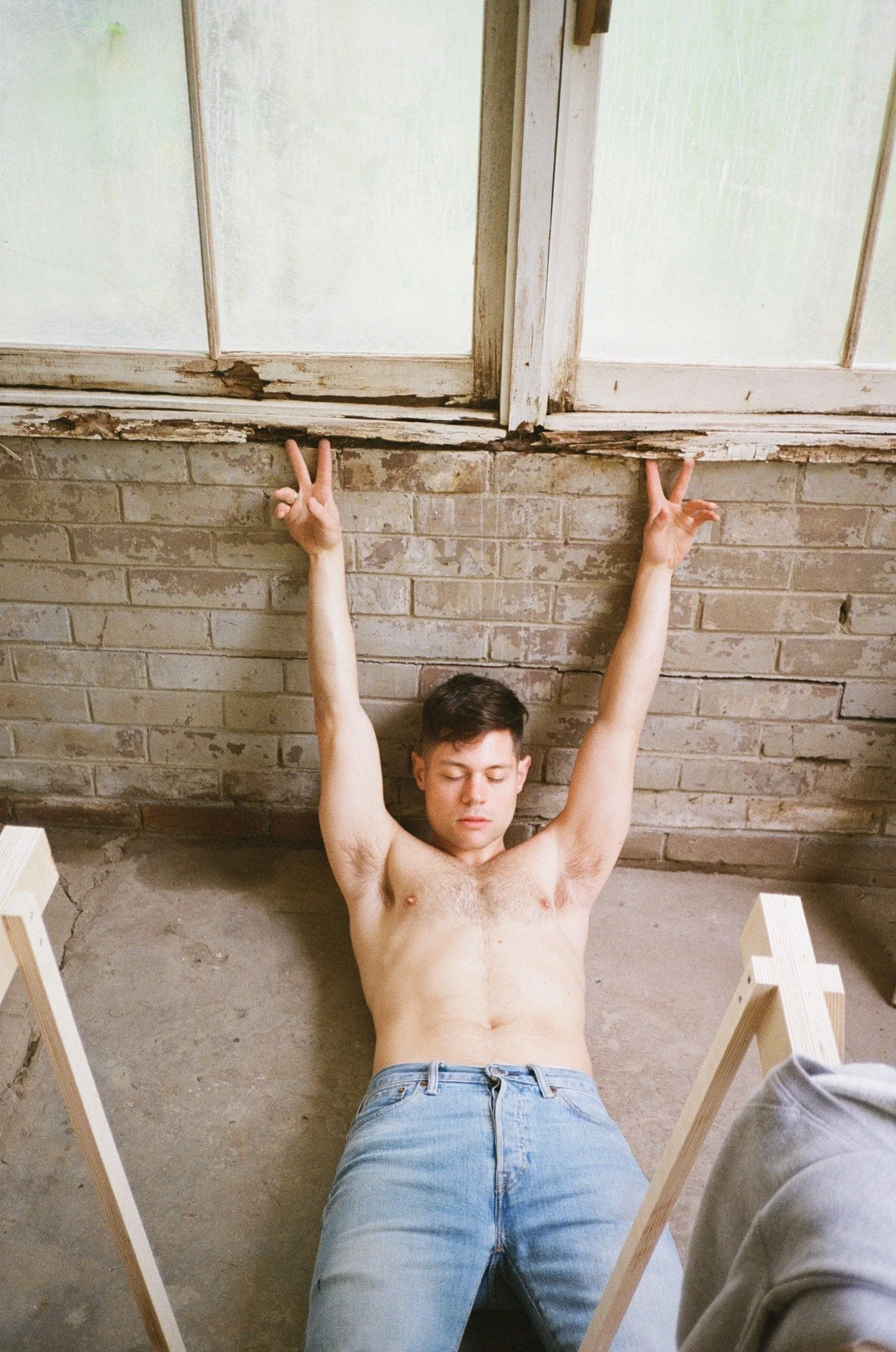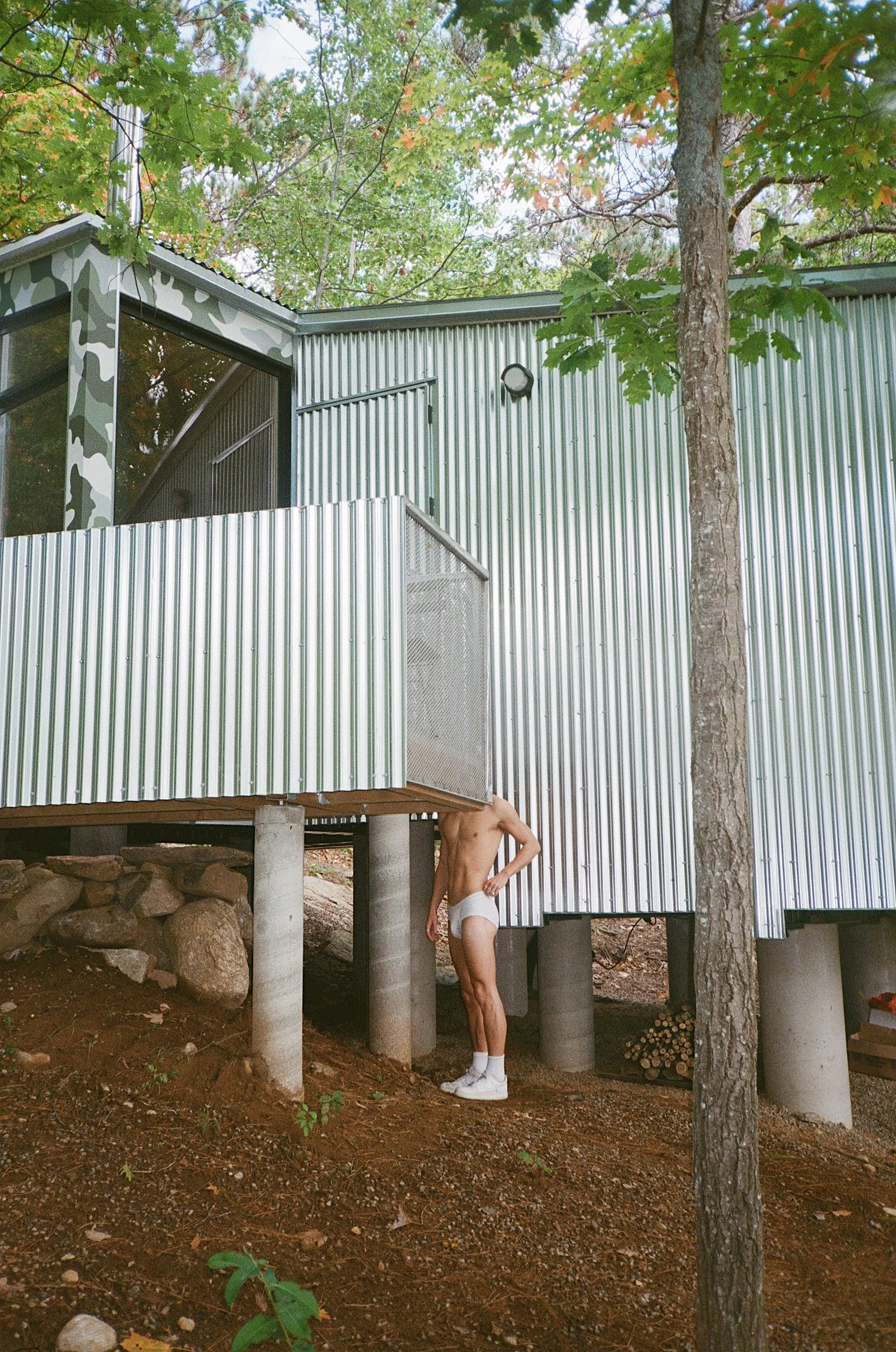 In a recent cabin designed by my studio, Common Accounts, we use shifts in the floor level to stage the queer body. Don't Let Me Be Lonely (South Algonquin Township, Ontario, 2021) is a satellite building in orbit of a larger cottage nearby. In staking out a domestic space apart from the main house where the larger family group gathers, it shelters the queering of leisure for its inhabitants. The gay throuple that often stays there is not the cabin's only occupants—a rotating cast of guests, friends, and family of the clients come and go—but they are a group that we designed for with great care as their needs were distinct from those of the other family members in heteronormative relationships who were comfortably accommodated in the existing building. Our approach resulted in a continuous interior organized across many stepping levels. In approximating the site's slope below, this floor offers platforms the staging and presentation of the body and the activity it engages in. The bed is like a thrust stage at the centre of the north half of the building, projecting outward from the steps that flank it on both sides.